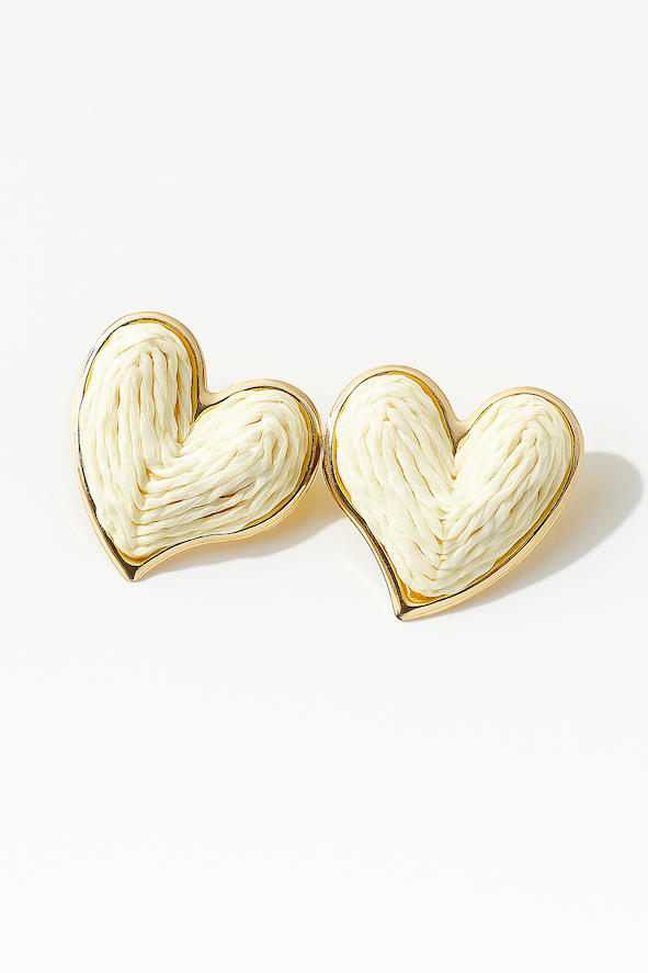 Σκουλαρίκια σε σχήμα καρδιάς με πλεγμένη υφή σε φυσικό λευκό χρώμα και χρυσό περίγραμμα. Ιδανικά για μια κομψή και ρομαντική εμφάνιση.