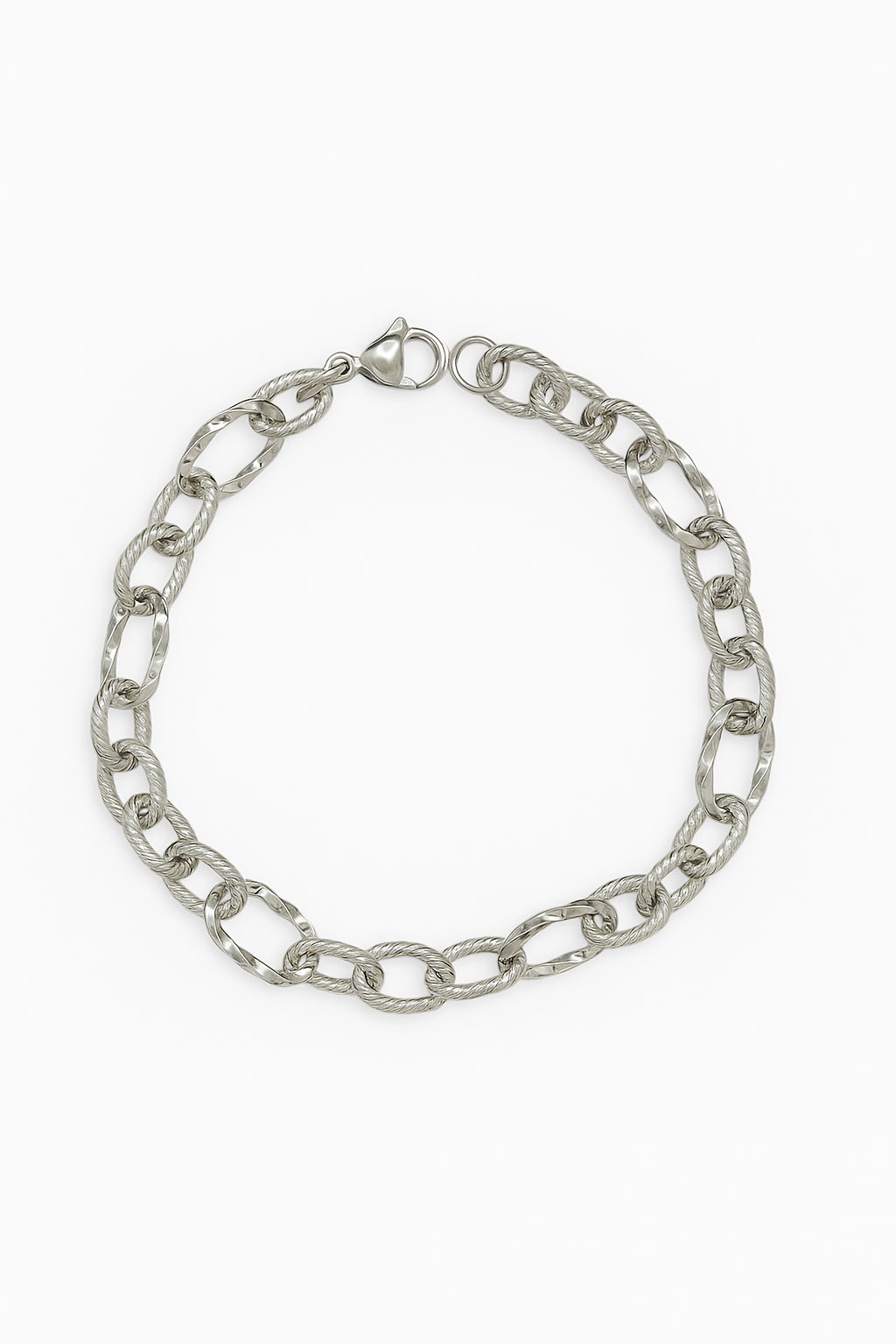 Κομψό ατσάλινο βραχιόλι με εναλλασσόμενους λείους και ραβδωτούς κρίκους. Ανθεκτικό και μοντέρνο, ιδανικό για καθημερινή χρήση.